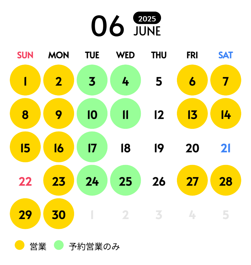 6月の営業日は基本的に月、金、土、日となります。営業時間は18時~1時です。